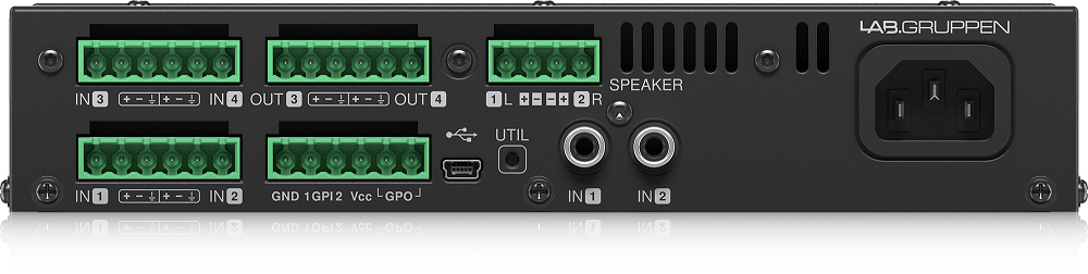 Аудиовходы: балансные 4х Euroblock 3-pin и небалансные 2х RCA (входы 1 и 2); аудиовыходы на акустику - 2х Euroblock 2-pin. Контакты расположены на тыльной части корпуса. Лицевая панель: регуляторы усиления для каждого из двух аудиовходов и светодиодная индикация. Защита от перегрузки по току, постоянного напряжения, КЗ и перегрева. Питание от сети ~220В, для охлаждения используются бесшумные вентиляторы. Автоматический переход в ждущий режим с пониженным энергопотреблением при отсутствии активности в течение 20 минут.