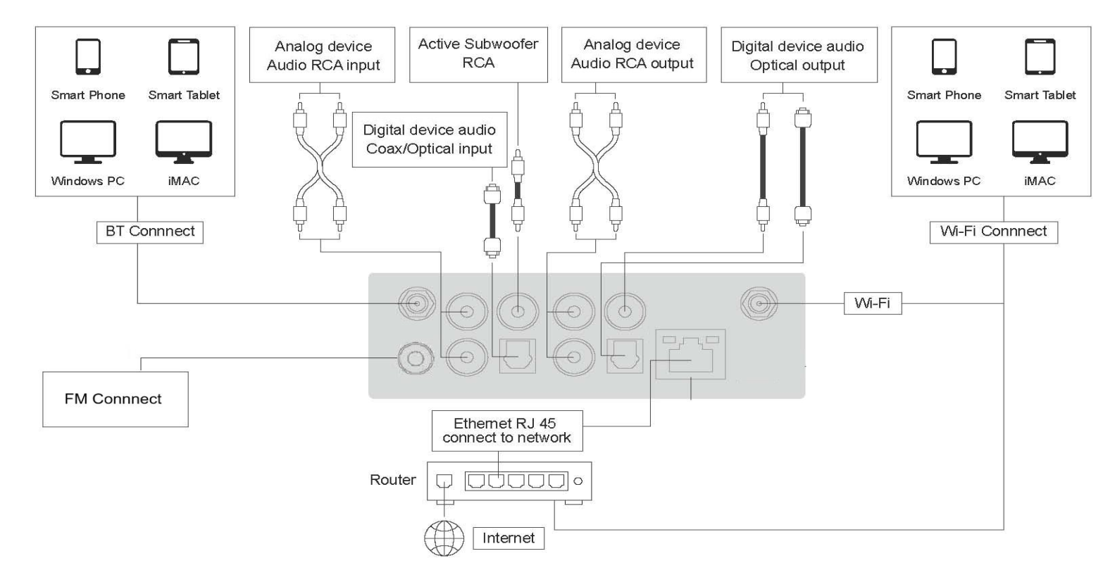 Встроенный сетевой медиаплеер имеет следующие характеристики. Поддерживает воспроизведение основных цифровых форматов файлов, включая музыку высокого разрешения: FLAC / MP3 / AAC / AAC+ / ALAC / APE / WAV. В качестве источника сигнала могут выступать множество различных вариантов: USB-носитель, подключенный в соответствующий слот; мобильное устройство (гаджет), подключенное с помощью беспроводной технологии Bluetooth (версия 5.0, поддержка аудиокодека AptX-HD); персональный компьютер, беспроводное/проводное подключение; популярная профессиональная стриминговая платформа (Spotify, Deezer, Quboz, TuneIn, Napster и т.п.); внешние аналоговый и цифровой аудиоприборы, разъемы для подключения 1x 2RCA (линейный) и 1x Toslink (оптический); AirPlay, Foobar2000, Musicbee и другие сторонние DLNA-приложения; встроенный цифровой DUB/FM-тюнер (требуется подключить внешнюю антенну). Предусмотрен внутренний таймер, благодаря которому можно настраивать расписание.