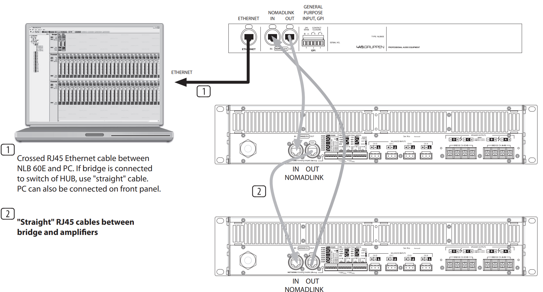 Ручная настройка и управление работой устройства производится за счет трех блоков DIP-переключателей, расположенных на тыльной части корпуса. С их помощью задается режим работы, определяется количество активных каналов, регулируется уровень усиления, настраивается лимитер и выполняются иные функции. Также возможно дистанционное управление с аналогичным функционалом и мониторинг состояния системы. Для этого усилитель требуется подключить в сеть Ethernet с контроллером NLB60E в составе на который установлено специализированное ПО. Подключение к сети посредством двух разъемов RJ-45 (IN/OUT, NomadLink).