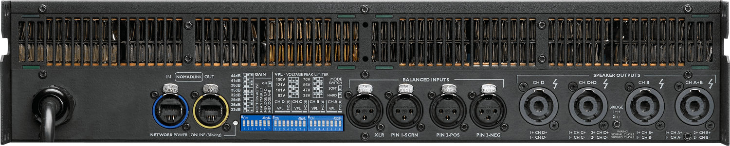 Четырехканальный усилитель, подключение в низкоомные (импеданс 2-4-8-16 Ом) или трансляционные (напряжение 25/70/100В) линии. Режим работы каждого канала настраивается отдельно. Выходная мощность зависит от типа подключения и количества активных каналов, варьируется в диапазоне 500 - 2000 Вт. Встроенный аудиопроцессор DSP Lake (АЦП/ЦАП 48/96 кГц, 32 бит): 4 пресета и микшеринг сигналов со входов на выходы. Частотный диапазон 20 Гц - 20 кГц. Аналоговые аудиовходы: 4х Euroblock 3-pin; цифровые аудиовходы: 2х AES3 (Euroblock 3-pin); аудиовыходы 4х Euroblock 2-pin; 8 вх/вых каналов DANTE (2х RJ-45). Питание ~ 220 В, два вентилятора, автоматический ждущий режим. Габаритные размеры 483x44x463 мм; рэковый размер 1U, вес 8.3 кг.