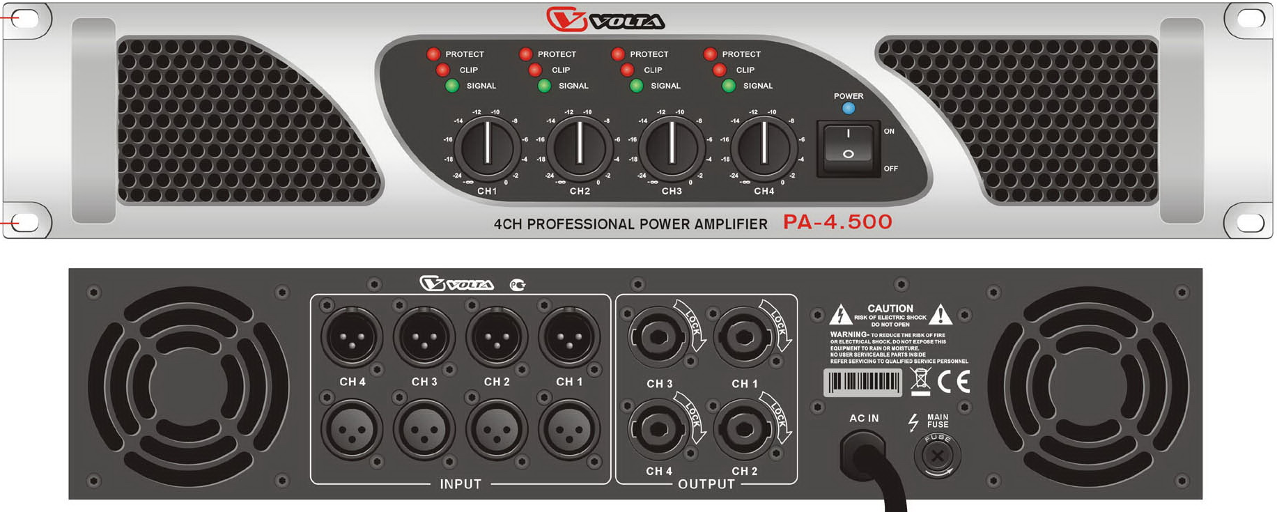VOLTA PА-4.500 - это профессиональный четырехканальный усилитель мощности с выходным каскадом класса AB. Подходит для создания на его базе системы озвучивания коммерческих помещений: рестораны и кафе, магазины, супермаркеты, бутики и другие виды торговых площадей, офисы, лобби отелей, залы ожидания т.д., и т.п.