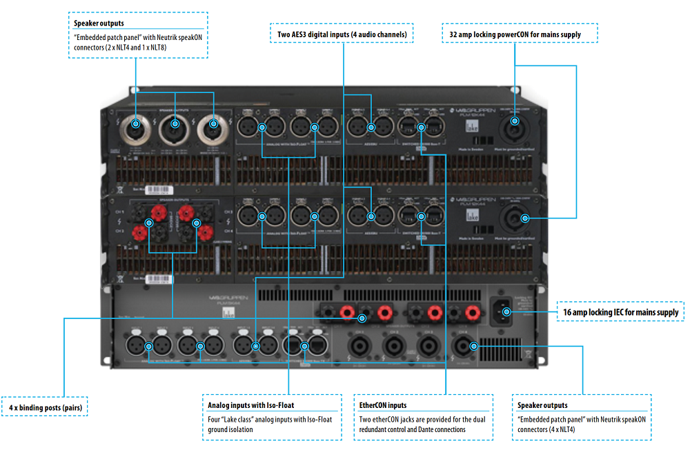 Аналоговые аудиовходы: 4х XLR 3-pin (Iso Flat); цифровые аудиовходы: 4х AES (2 пары на 2х XLR 3-pin). Аудиовыходы: 4х пары винтовых зажимов. Каналы DANTE: 8 входных и 8 выходных на разъемах 2х RJ-45. Защита от перегрузки по току, высоких частот, постоянного напряжения, КЗ, перегрева + настраиваемый лимитер. Для охлаждения предусмотрены три вентилятора с "умным" термоконтроллером.