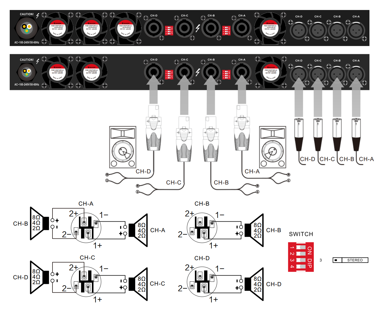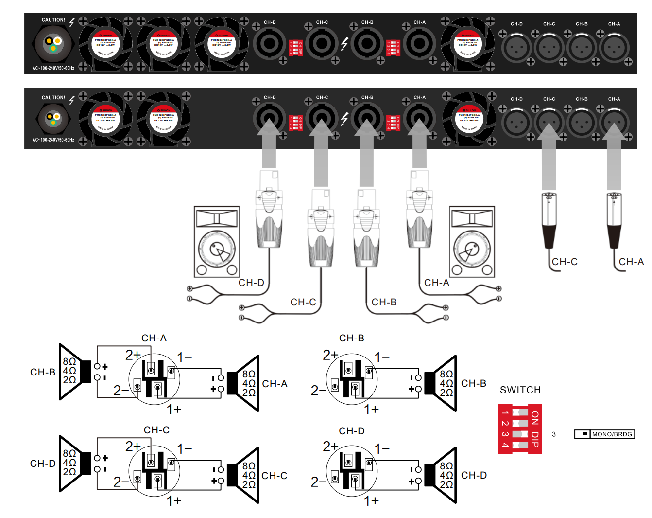 Применяется с низкоомными акустическими системами, импеданс 2-4-8-16 Ом. Номинальная мощность на каждый канал составляет 2600 Вт, реальная мощность на выходе зависит от импеданса и количестве активных каналов. При стереорежиме (4 канала): 4x 650 Вт (8 Ом), 4x 1100 Вт (4 Ом); 4x 1870 Вт (2 Ом); при мостовом режиме (2 канала): 2х 1300 Вт (16 Ом), 2х 2200 Вт (8 Ом), 2х 3740 Вт (4 Ом). Режим работы определяется подключением (см. схему ниже).