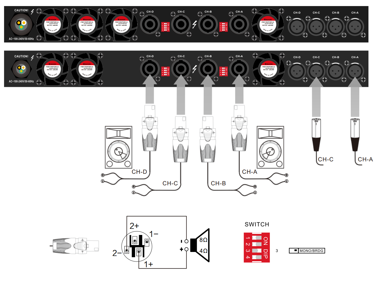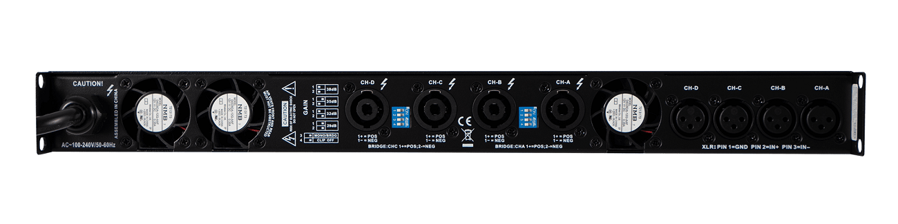 Аудиовходы: 4х XLR 3-pin, балансное подключение с импедансом 20 кОм, небалансное - 10 кОм. Входная чувствительность регулируется: 38, 35, 32 или 29 дБ. Четыре аудиовыхода реализованы на разъемах SpeakON. Все коннекторы размещены на тыльной части корпуса. На лицевой панели только кнопка активации и светодиодные индикаторы.