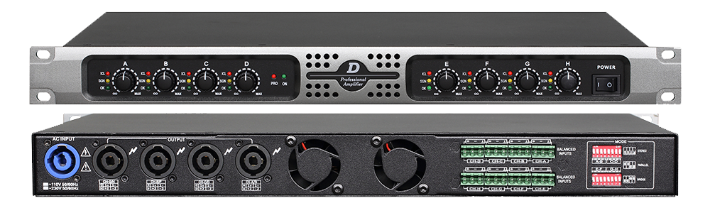 Аудиовходы (8 шт.) реализованы на балансных разъёмах XLR (импеданс 20 кОм) и небалансных XLR (импеданс 10 кОм); аудиовыходы 8х SPEAKON. Коннекторы размещены на тыльной части корпуса. На передней панели предусмотрена светодиодная индикация и восемь регуляторов для ручного изменения уровня усиления в случае необходимости.