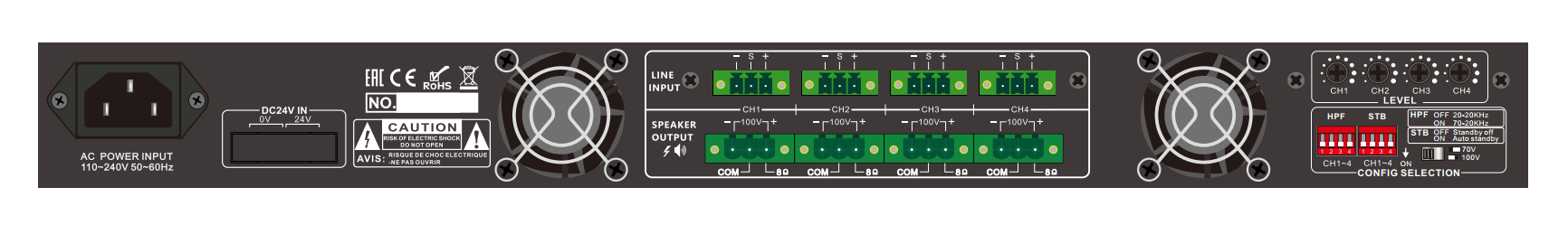 Четыре независимых канала усиления, мощность 4х 500 Вт. Вместе с усилителем можно применять как низкоомную акустику с импедансом 8 Ом, так и трансляционную, с рабочим напряжением 70/100В. Каждому линейному входу соответствует свой выход на акустику. Все коннекторы представлены разъемами Euroblock 3-pin и размещены на тыльной части корпуса. ВАЖНО! Одновременно можно использовать только акустические системы одного типа!