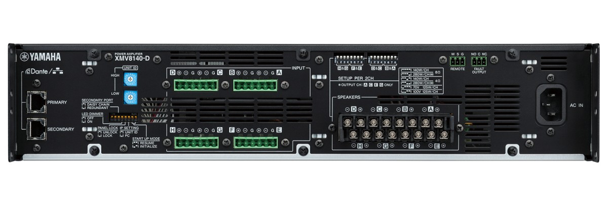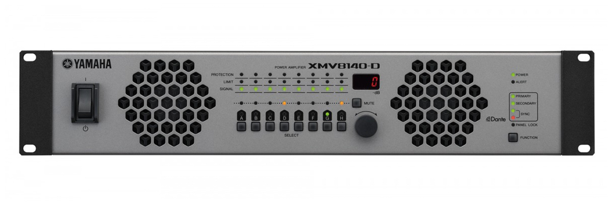YAMAHA XMV8140-D - это восьмиканальный трансляционный усилитель класса D и мощностью 8 х 140 Вт. Данная модель предназначена для коммерческих инсталляций в барах и ресторанах, гостиницах и отелях, развлекательных комплексах и прочее. Особенность усилителя заключается в том, что управление им может осуществляться как непосредственно с приборной панели, так и удаленно с помощью интерфейса Dante. Также на передней панели прибора расположены цифровой дисплей и светодиодные индикаторы, которые отображают текущий режим работы. Корпус выполнен в надежной металлической конструкции и оснащен монтажными уголками, благодаря чему легко монтируется в рэковую стойку 19".