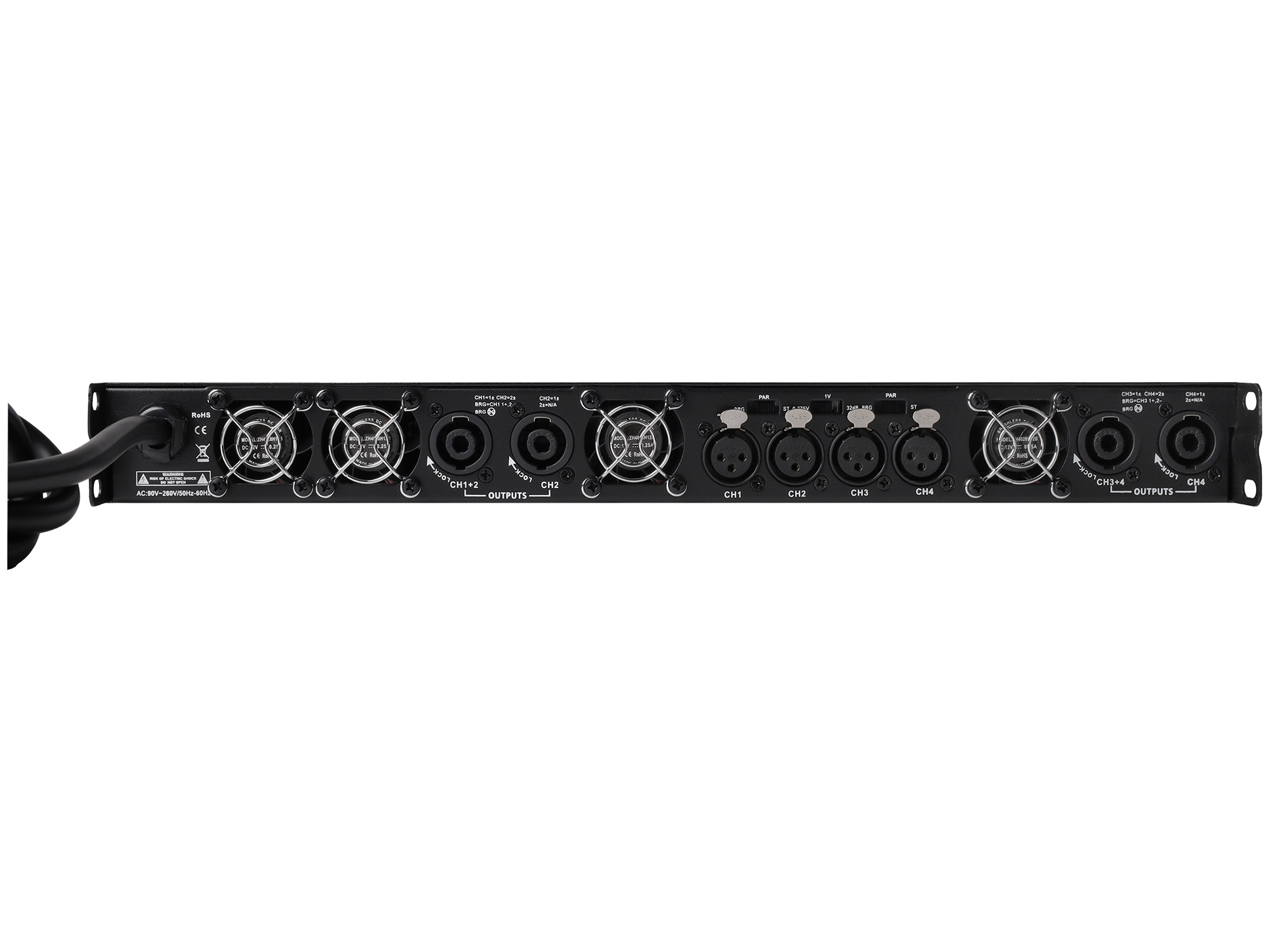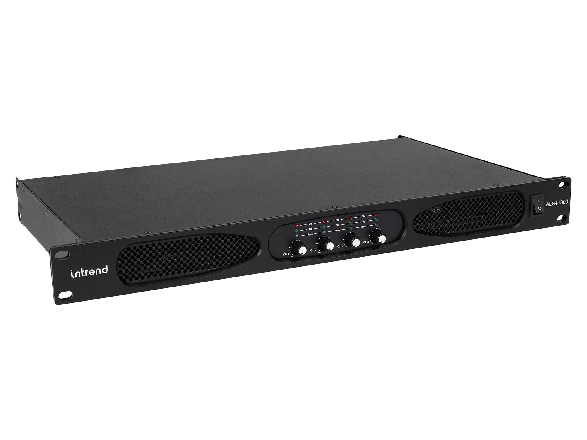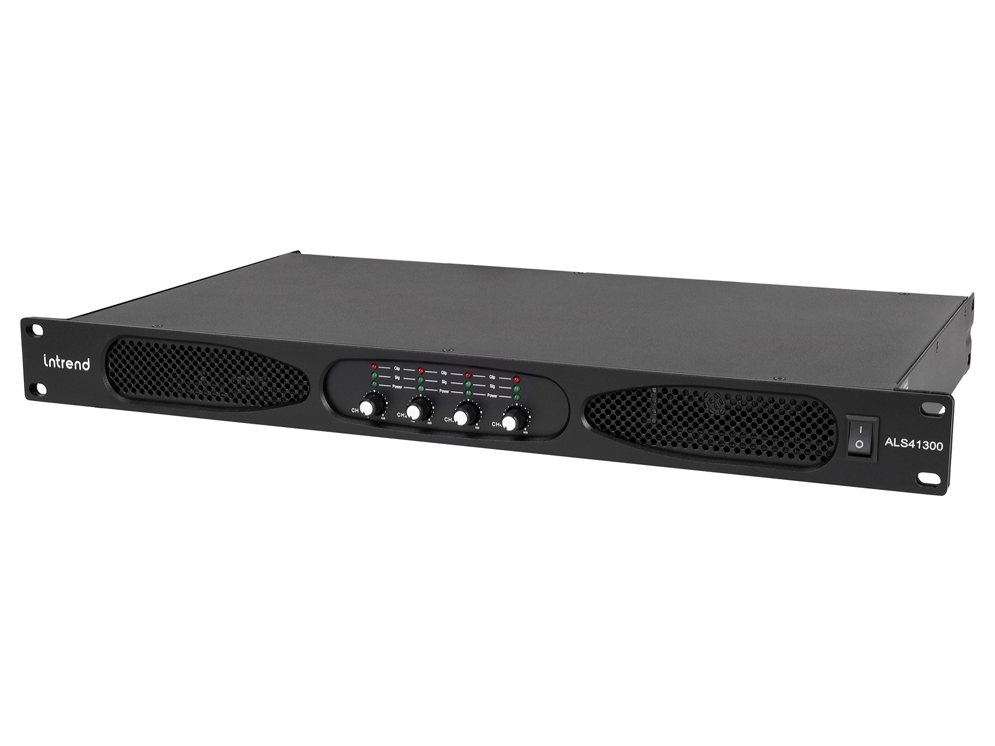 ALS 41300 это четырёхканальный низкоомный усилитель мощности в компактном 1U корпусе. На передней панели усилителя находятся регуляторы громкости для каждого канала, индикаторы уровня сигнала, перегрузки и защиты.
